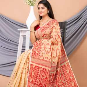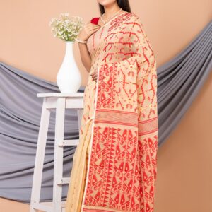 Beige & Red ethnics motifs pure cotton Dhakai Jamdani Saree.
