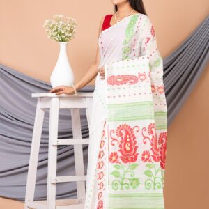White & Multi pure cotton floral design jamdani saree