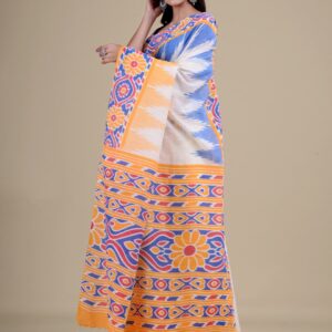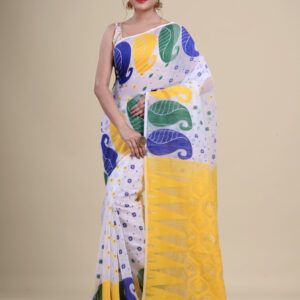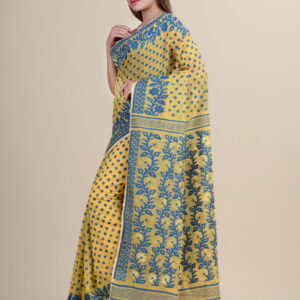 Yellow & Blue floral design pure cotton Dhakai Jamdani Saree.