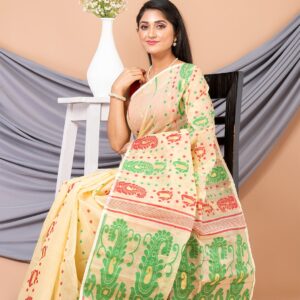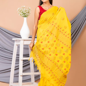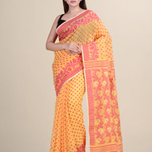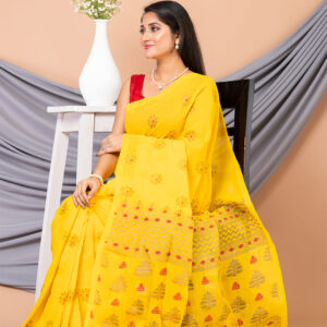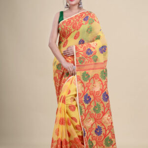 Yellow & Red floral design pure cotton Dhakai Jamdani Saree.