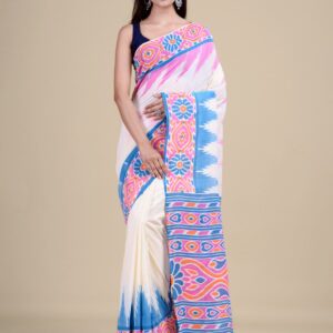 White & Blue Pure cotton printed Handloom Saree