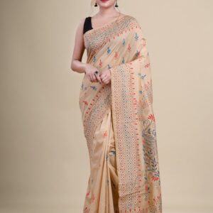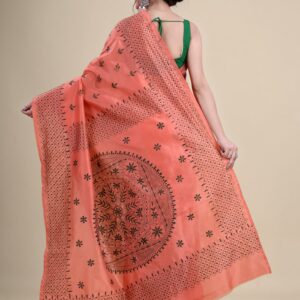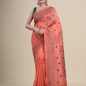 Acrylic, Bengali, Color, Fabric, Festival, Green, Kantha stitch Sarees, NEW ARRIVALs, PEACH, Saree