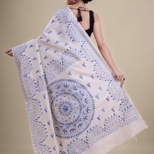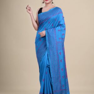 Acrylic, Bengali, Blue, Color, Fabric, Festival, Kantha stitch Sarees, NEW ARRIVALs, Saree, White