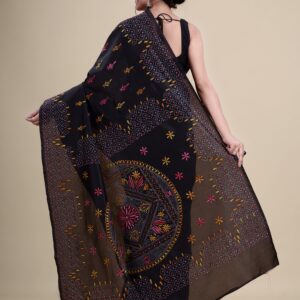 BLACK , PINK & YELLOW KATHA STITCH Saree.