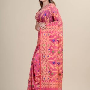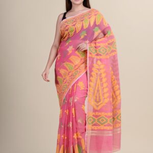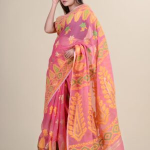 Pink & Yellow floral design cotton silk Dhakai Jamdani Saree.