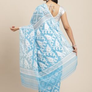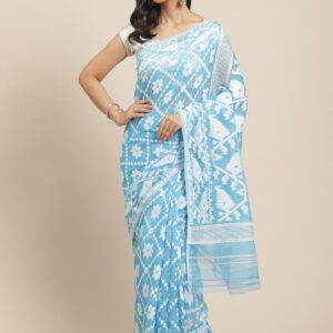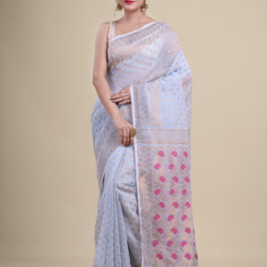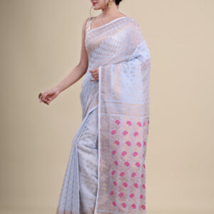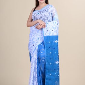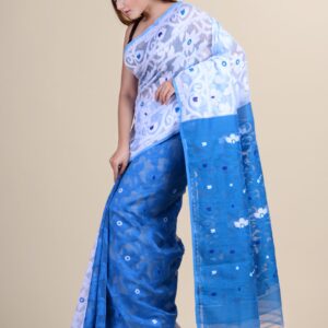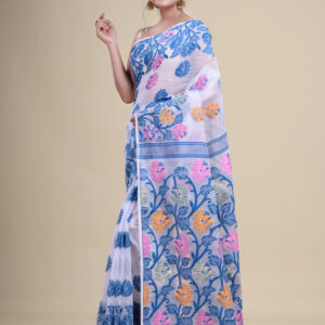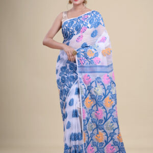 White & Blue floral design pure cotton Dhakai Jamdani Saree.