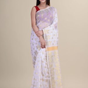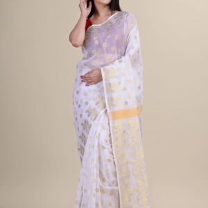White & Golden floral design cotton silk Dhakai Jamdani Saree.