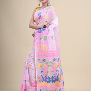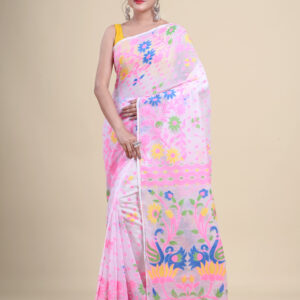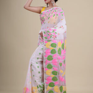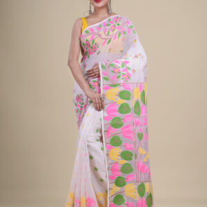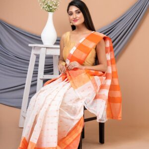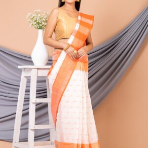 White & Orange floral design pure cotton Dhakai Jamdani Saree.