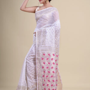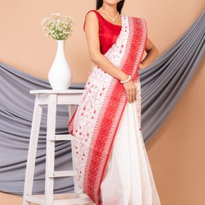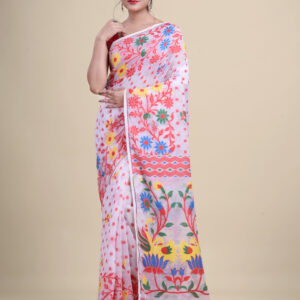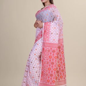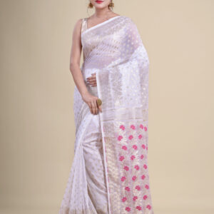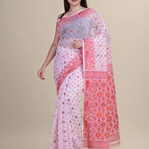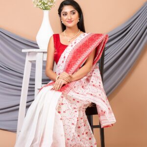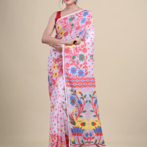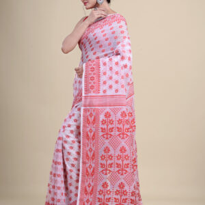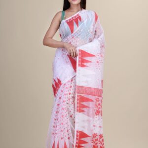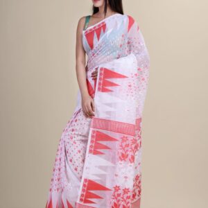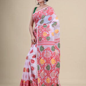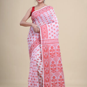 White & Red floral design pure cotton Dhakai Jamdani Saree.