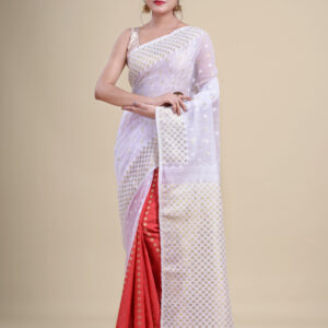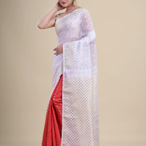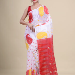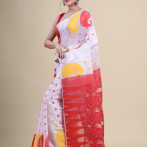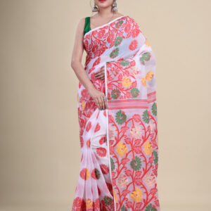 White & Red floral design cotton silk Dhakai Jamdani Saree.