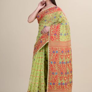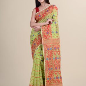 Green & Red ethnics motifs pure cotton Dhakai Jamdani Saree.