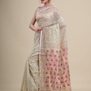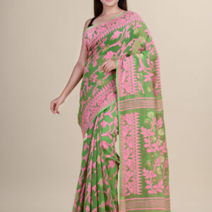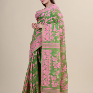 Green & Pink floral design cotton silk Dhakai Jamdani Saree.