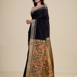 Black & Golden floral printed cotton handloom saree with blouse material