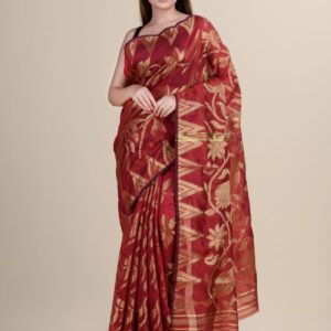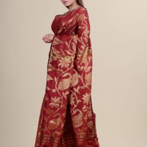 Maroon & Golden floral design cotton silk Jamdani Saree.