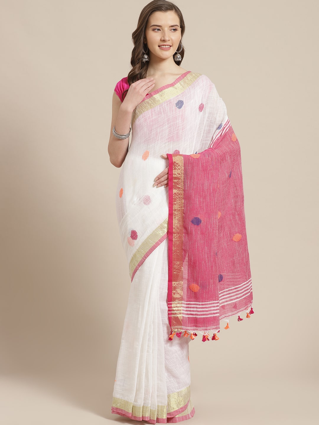 The Handloom sari is a traditional Indian attire that can be worn on all occasions, be it a wedding or a religious event. It has become very popular among women in India. This handloom sari is made from soft cotton fabric and decorated with multi-color thread-weaved designs to give it an elegant look. This beautiful sari is a great investment piece and can be worn on all occasions. It comes with an unstitched blouse piece which will fit perfectly with your body type.
