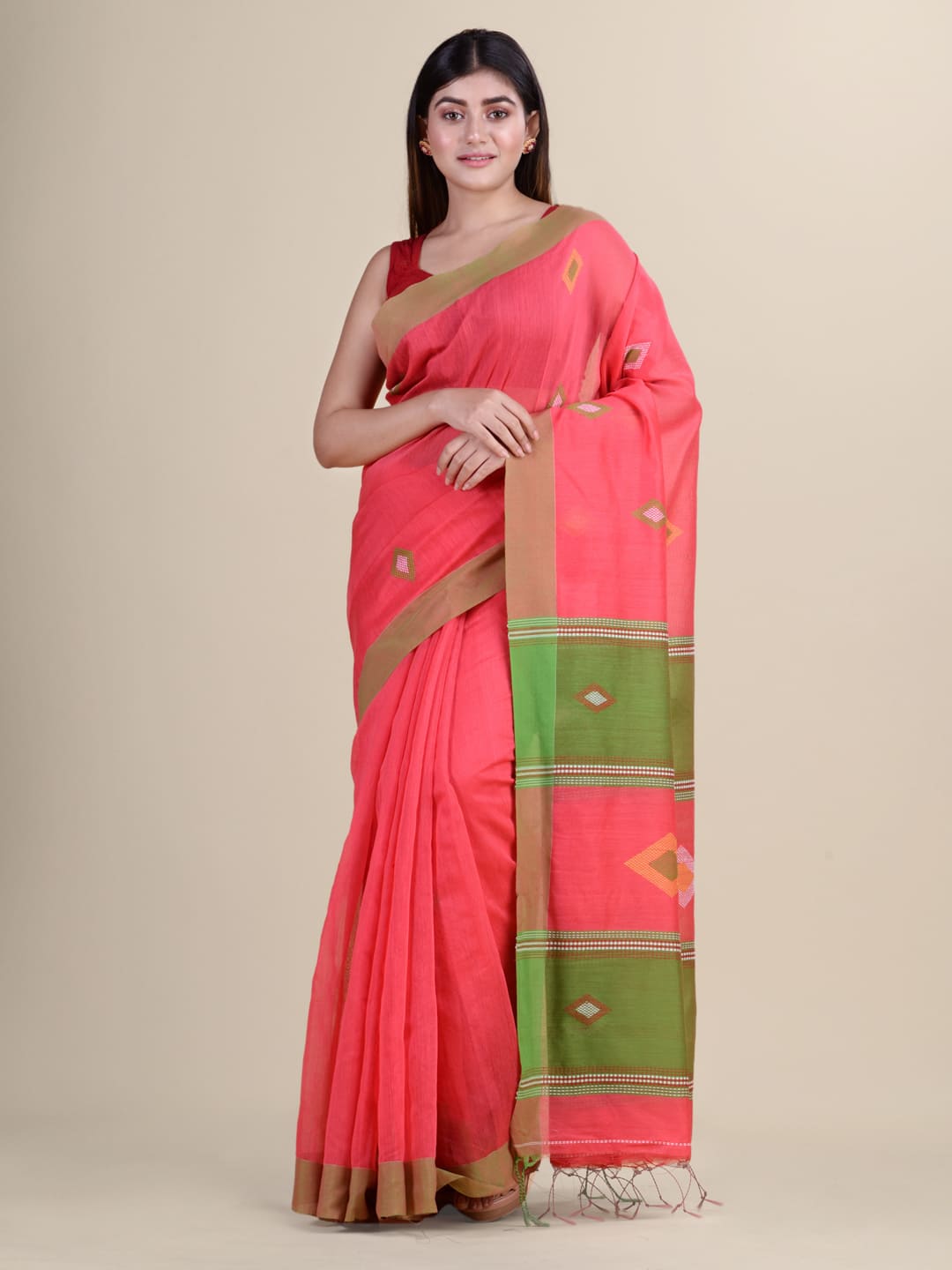 The Handloom sari is a traditional Indian attire that can be worn on all occasions, be it a wedding or a religious event. It has become very popular among women in India. This handloom sari is made from soft cotton fabric and decorated with multi-color thread-weaved designs to give it an elegant look. This beautiful sari is a great investment piece and can be worn on all occasions. It comes with an unstitched blouse piece which will fit perfectly with your body type.