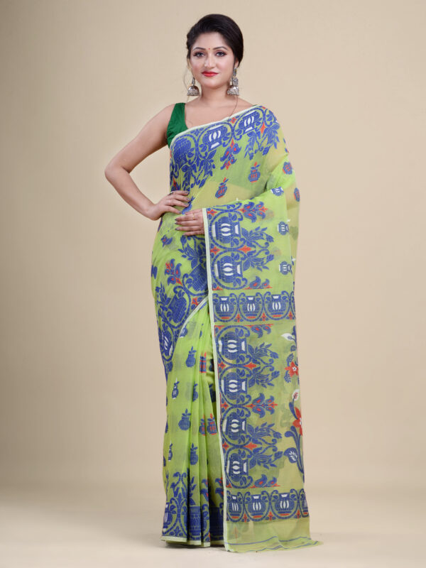 Green & Blue floral design pure cotton Dhakai Jamdani Saree.