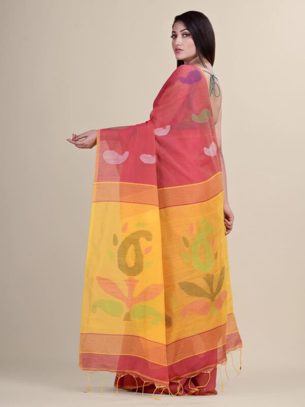 The Handloom sari is a traditional Indian attire that can be worn on all occasions, be it a wedding or a religious event. It has become very popular among women in India. This handloom sari is made from soft cotton fabric and decorated with multi-color thread-weaved designs to give it an elegant look. This beautiful sari is a great investment piece and can be worn on all occasions. It comes with an unstitched blouse piece which will fit perfectly with your body type.