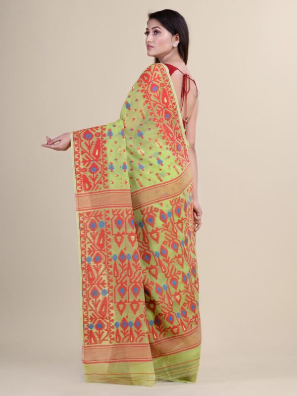 Green & Red ethnics motifs pure cotton Dhakai Jamdani Saree.