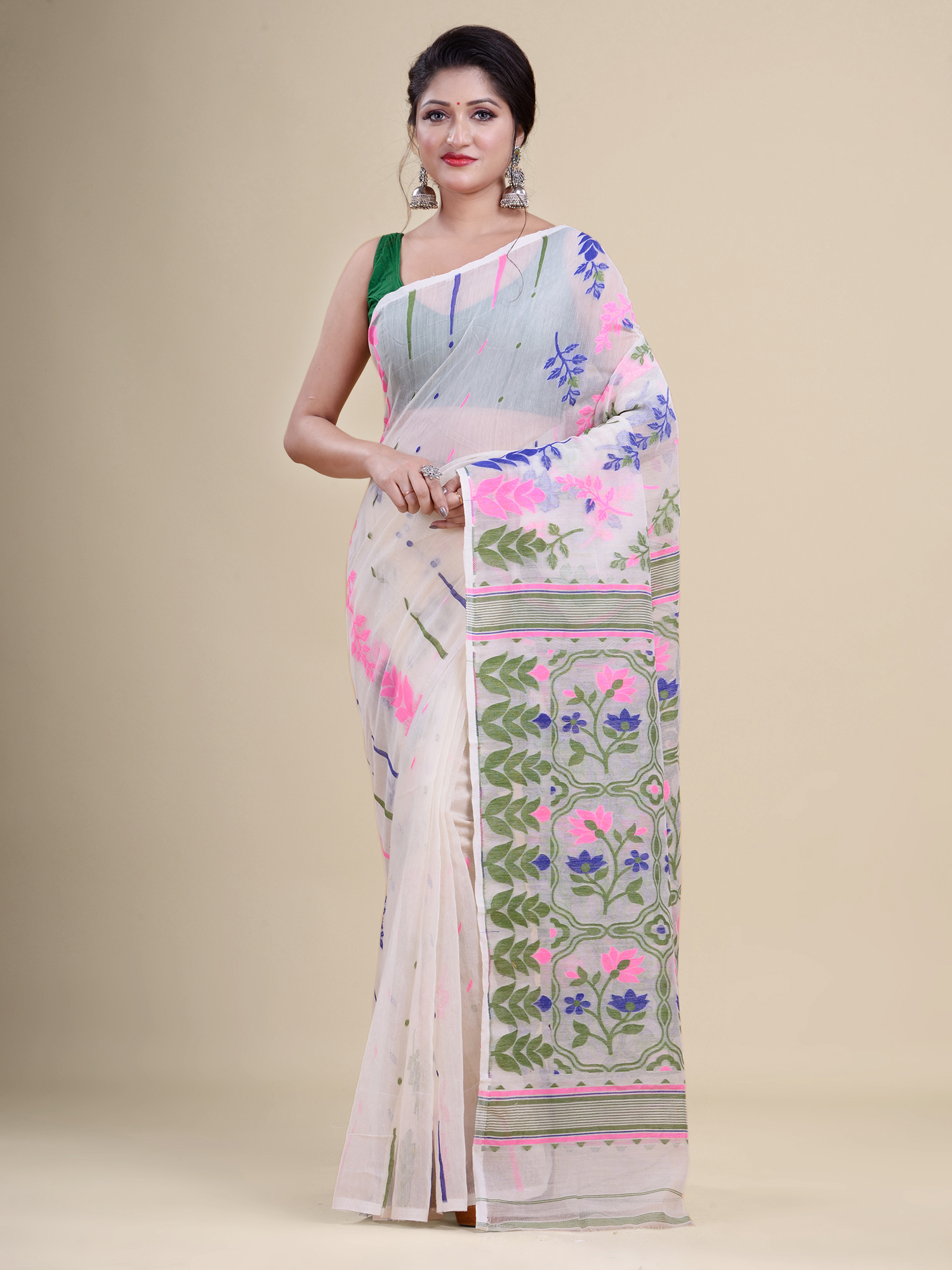 Laa Calcutta’s Jamdani Sarees is made of soft cotton and feature intricate dhakai jamdani designs. Our Jamdani Silk Sarees are also popular for their beautiful designs and quality craftsmanship. Jamdani saree is all about floral, paisley, ethnic motifs design on it. The vivid color and the comfortable fabric makes it more worthy.