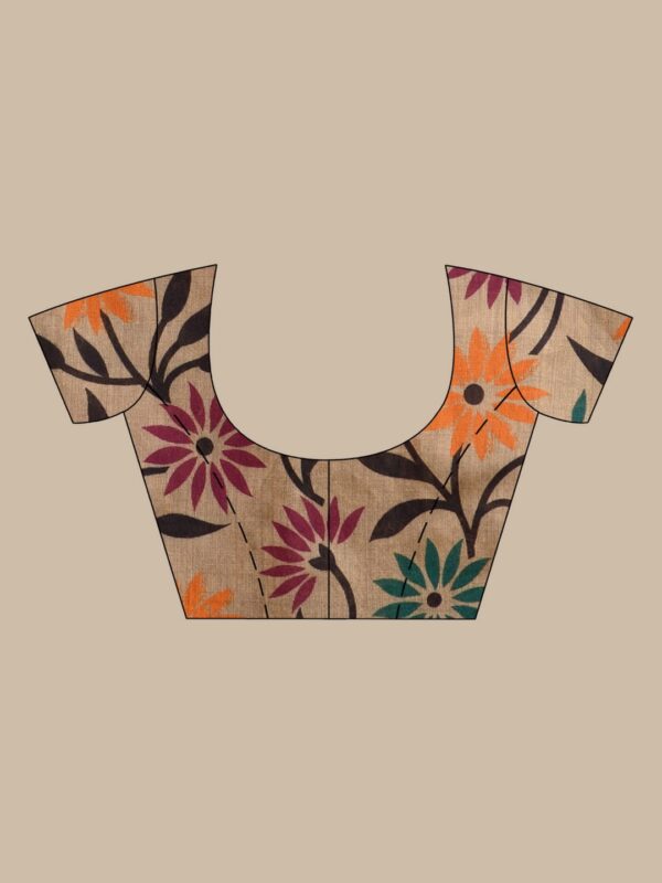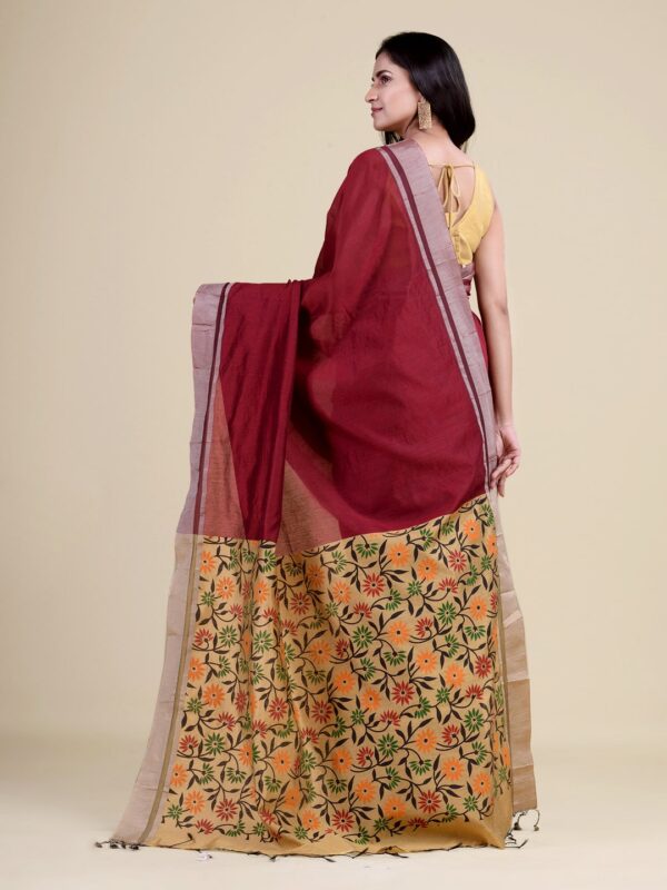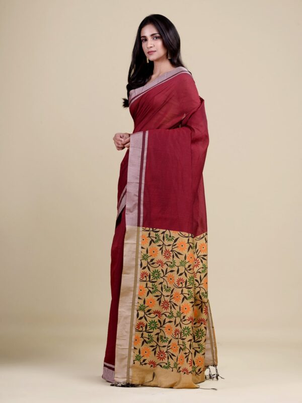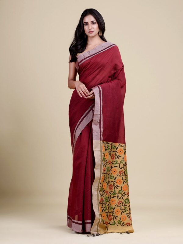 Maroon & Golden floral printed cotton handloom saree with blouse material