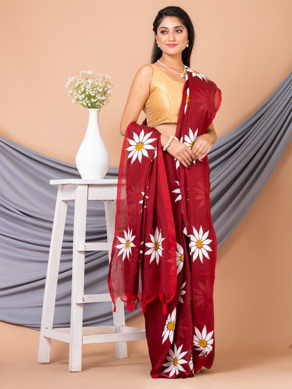 Maroon & White Pure cotton Sunflower design Handloom Saree