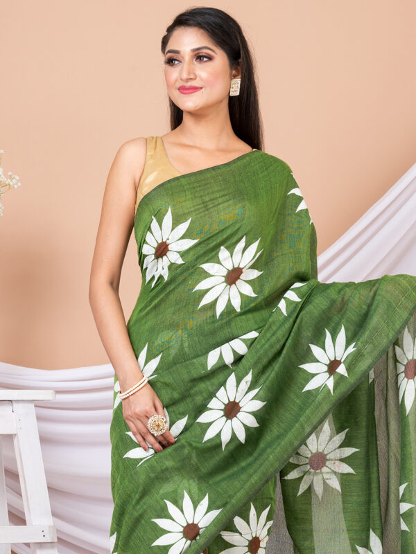 Moss Green & White Pure cotton Sunflower design Handloom Saree
