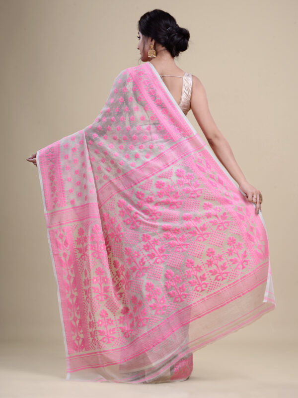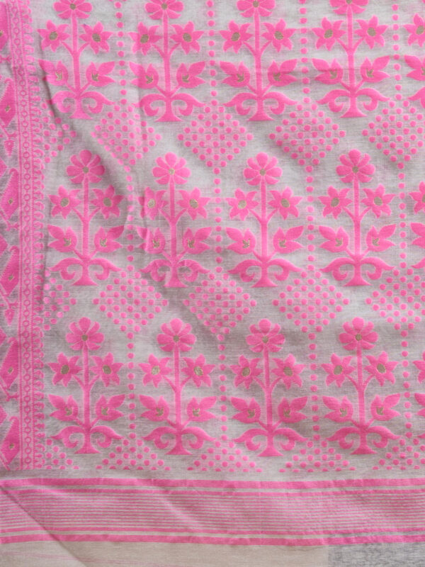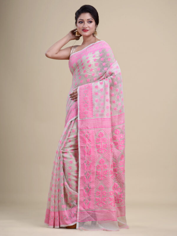 Off white & Pink floral design pure cotton Dhakai Jamdani Saree.