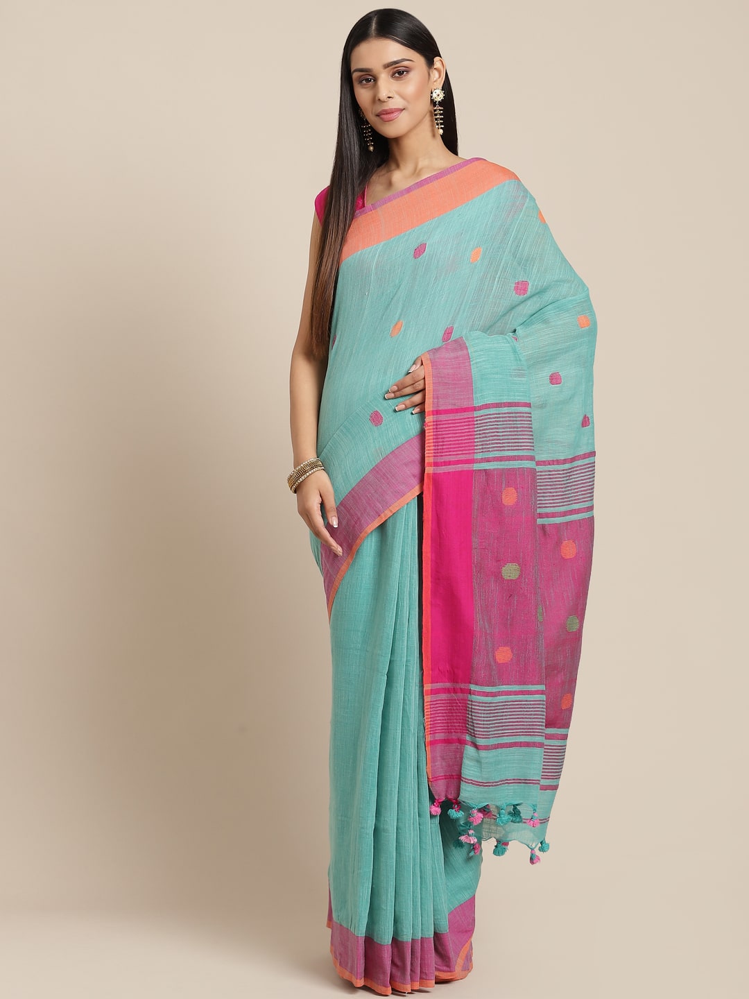 The Handloom sari is a traditional Indian attire that can be worn on all occasions, be it a wedding or a religious event. It has become very popular among women in India. This handloom sari is made from soft cotton fabric and decorated with multi-color thread-weaved designs to give it an elegant look. This beautiful sari is a great investment piece and can be worn on all occasions. It comes with an unstitched blouse piece which will fit perfectly with your body type.