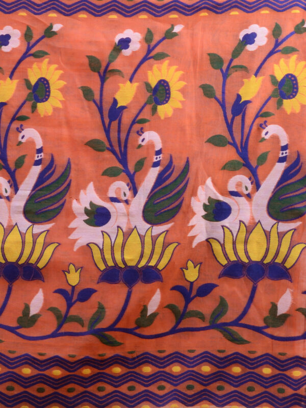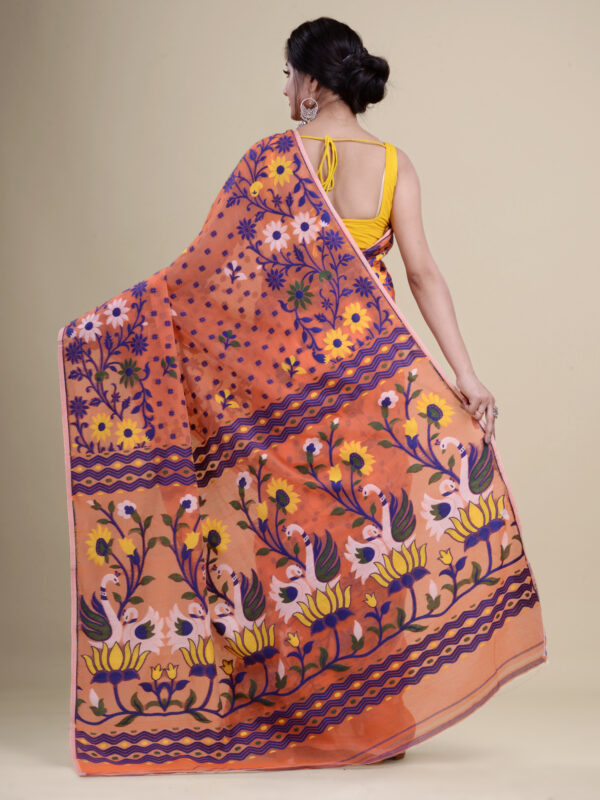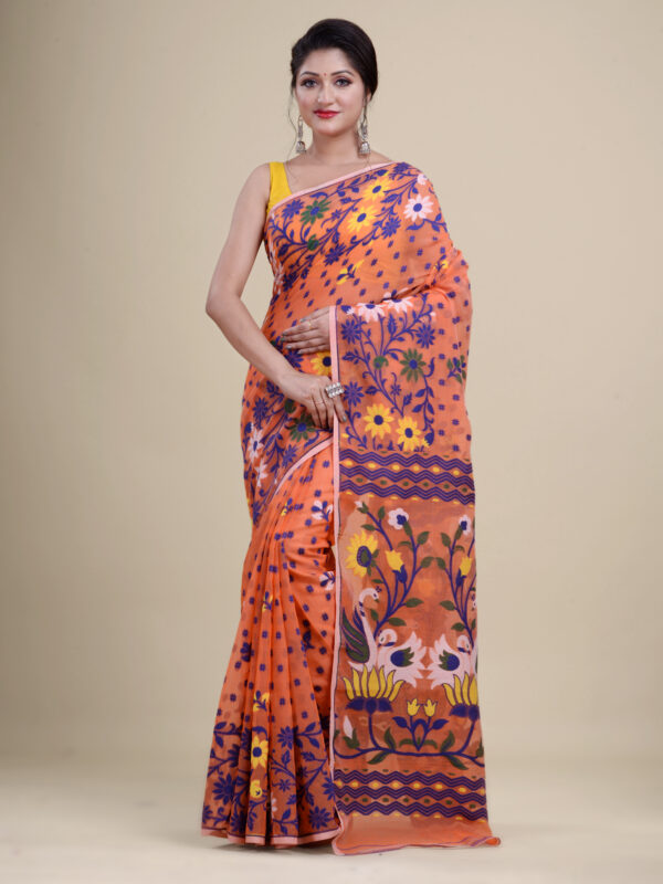 Orange & Multi floral design pure cotton Dhakai Jamdani Saree.