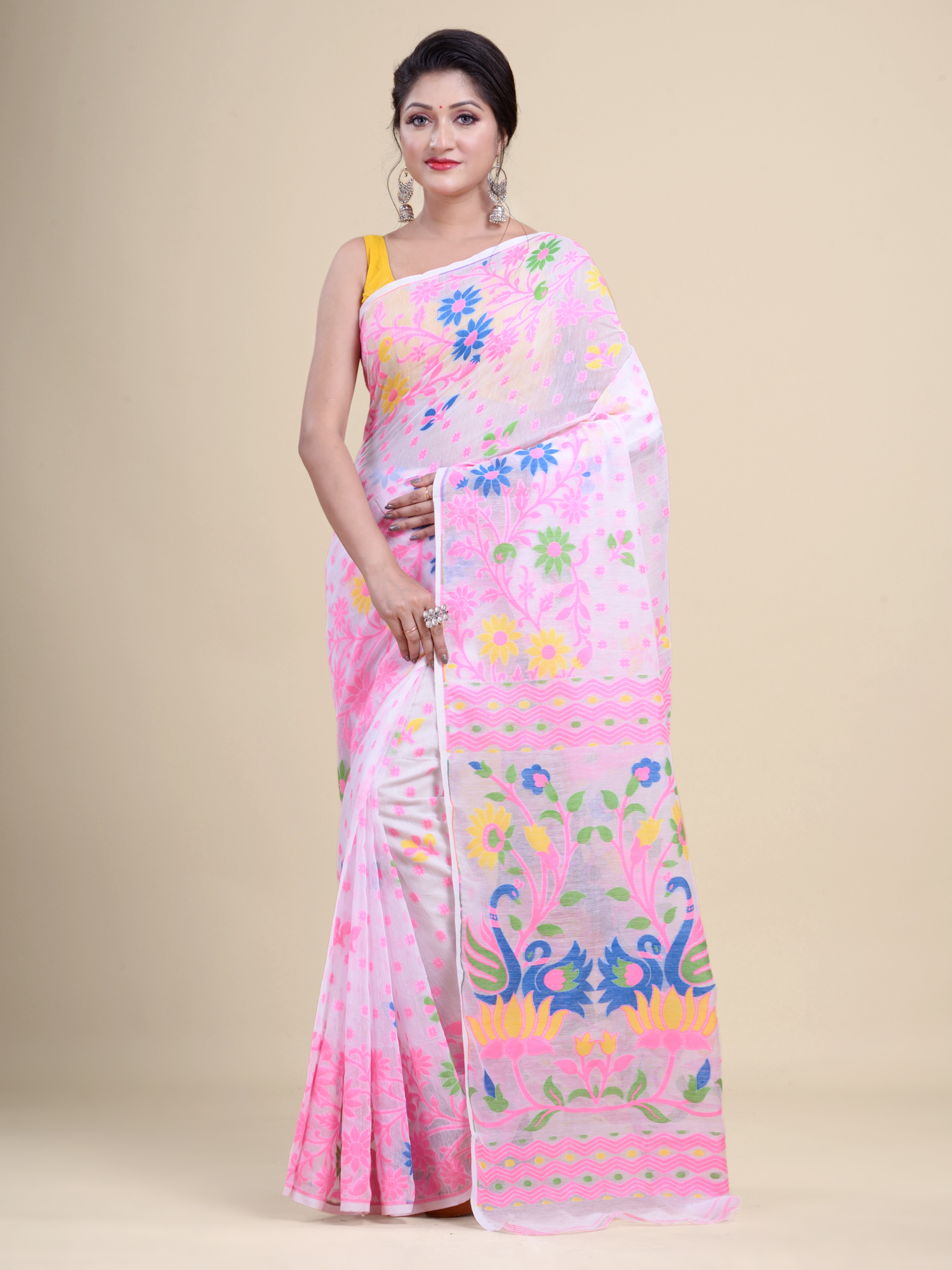 Orange & Multi floral design pure cotton Dhakai Jamdani Saree.