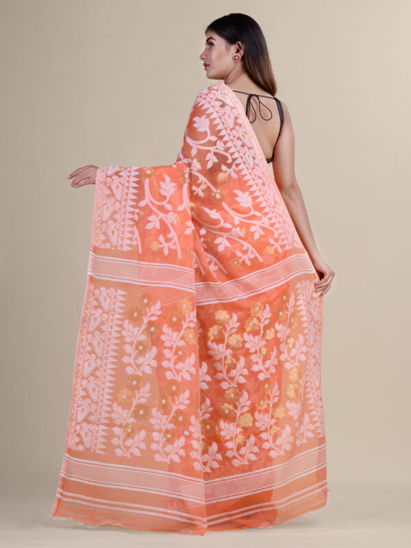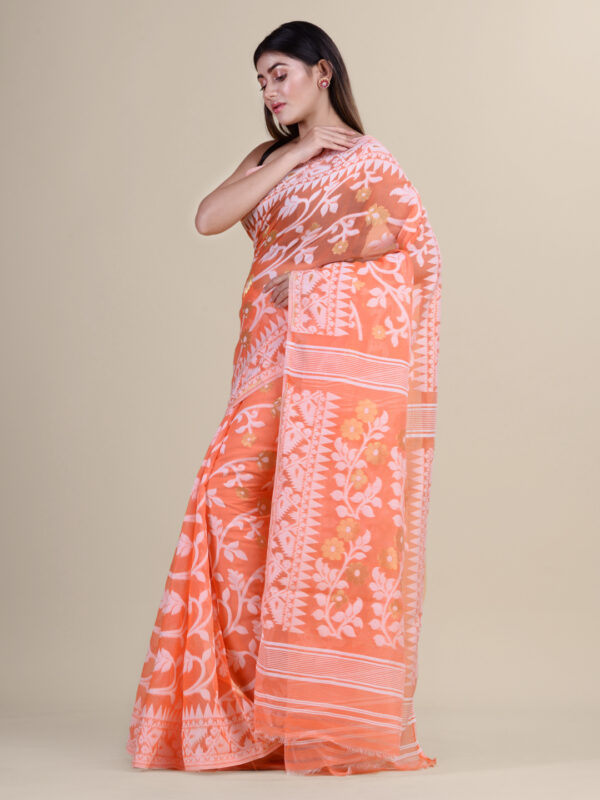 Orange & White floral design cotton silk Dhakai Jamdani Saree.
