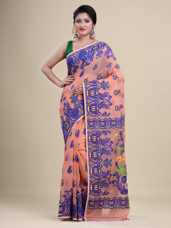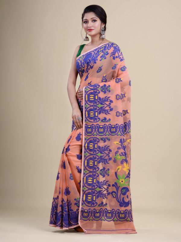 Peach & Blue floral design pure cotton Dhakai Jamdani Saree.