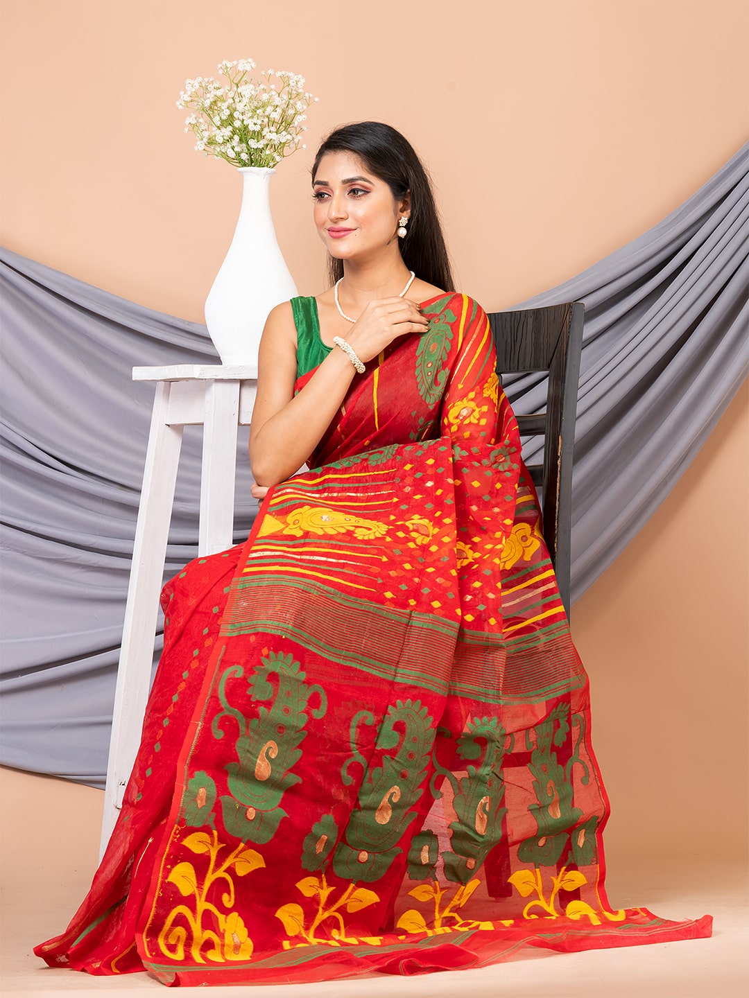 Laa Calcutta’s Jamdani Sarees is made of soft cotton and feature intricate dhakai jamdani designs. Our Jamdani Silk Sarees are also popular for their beautiful designs and quality craftsmanship. Jamdani saree is all about floral, paisley, ethnic motifs design on it. The vivid color and the comfortable fabric makes it more worthy.
