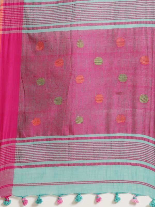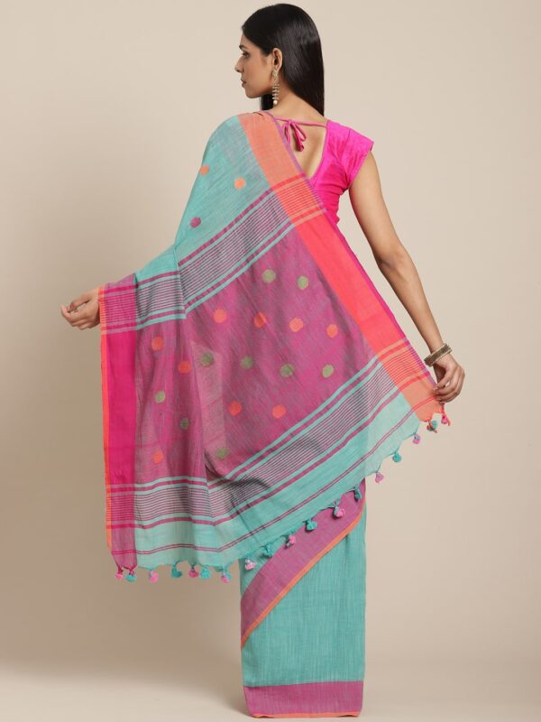 The Handloom sari is a traditional Indian attire that can be worn on all occasions, be it a wedding or a religious event. It has become very popular among women in India. This handloom sari is made from soft cotton fabric and decorated with multi-color thread-weaved designs to give it an elegant look. This beautiful sari is a great investment piece and can be worn on all occasions. It comes with an unstitched blouse piece which will fit perfectly with your body type.