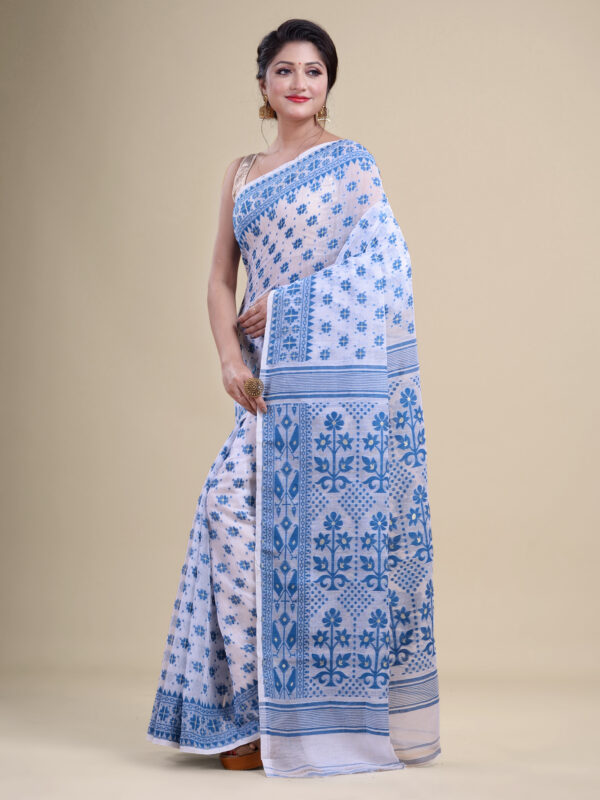 White & Blue floral design pure cotton Dhakai Jamdani Saree.