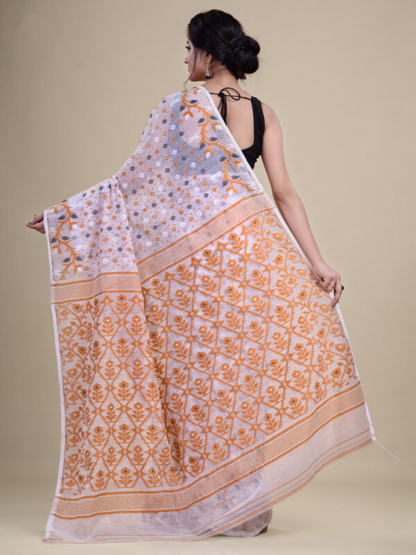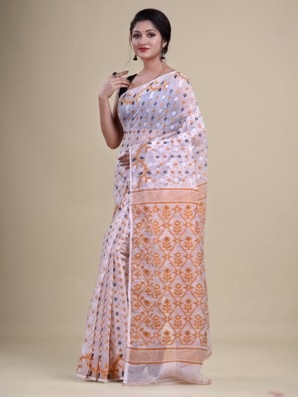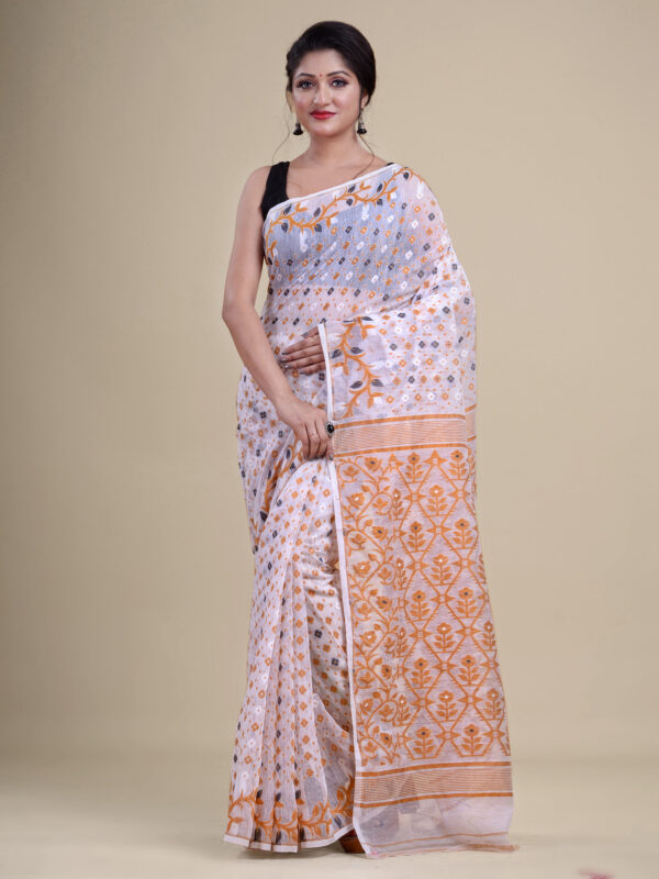 White & Brown ethnic motifs pure cotton Dhakai Jamdani Saree.