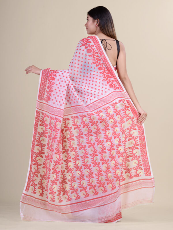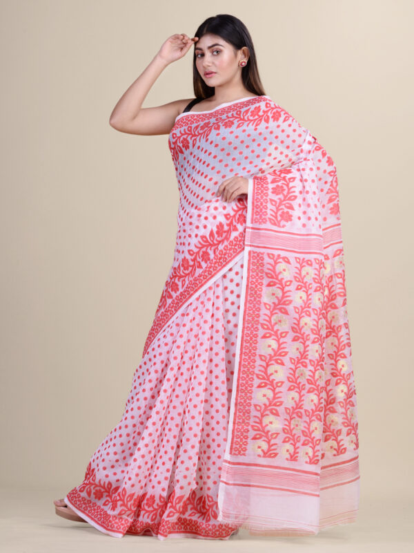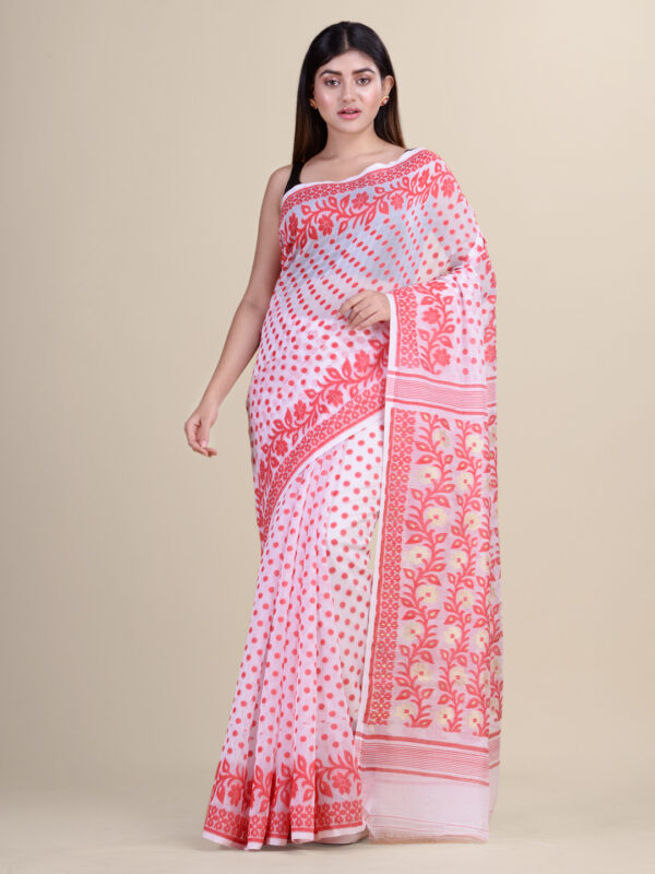White & Red ethnics motifs cotton silk Dhakai Jamdani Saree.