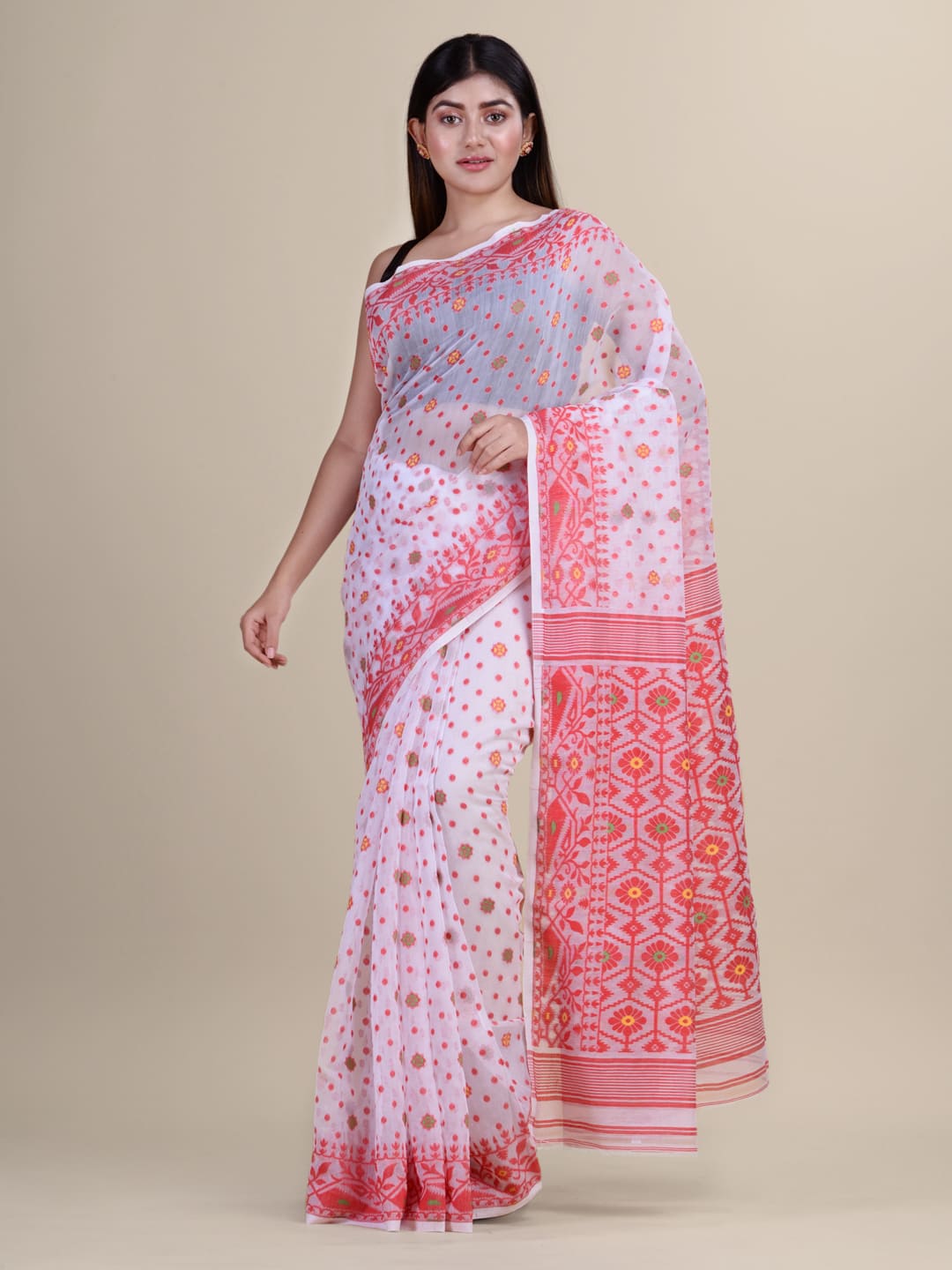 Laa Calcutta’s Jamdani Sarees is made of soft cotton and feature intricate dhakai jamdani designs. Our Jamdani Silk Sarees are also popular for their beautiful designs and quality craftsmanship. Jamdani saree is all about floral, paisley, ethnic motifs design on it. The vivid color and the comfortable fabric makes it more worthy.