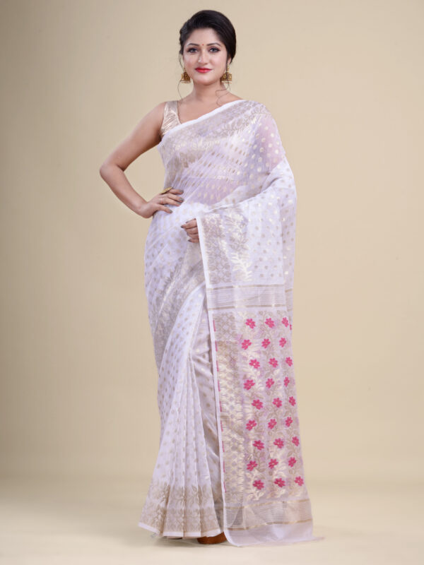 White & Red floral design cotton silk Dhakai Jamdani Saree.