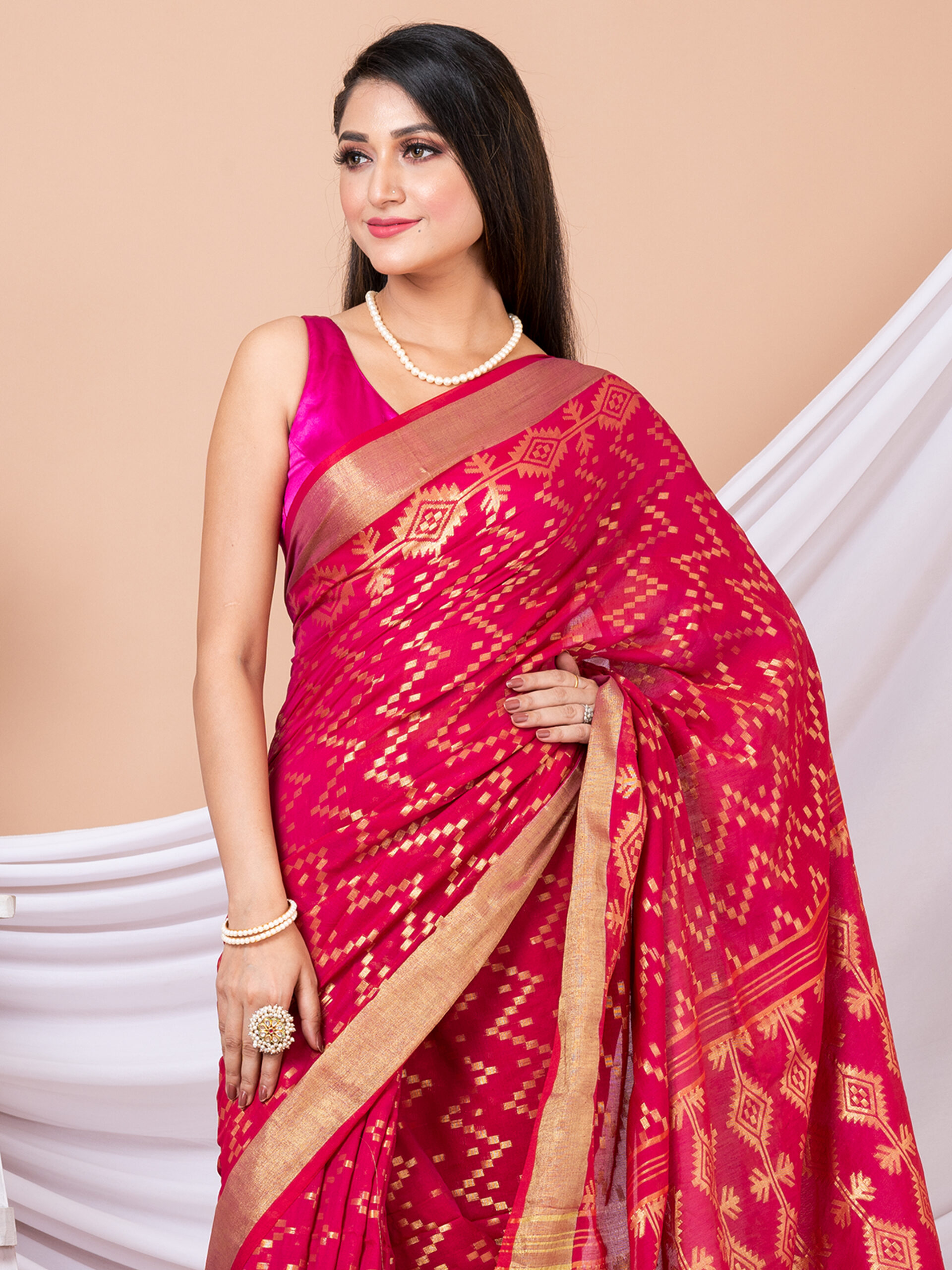 White & Red floral design pure cotton Dhakai Jamdani Saree.
