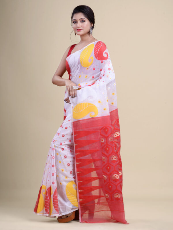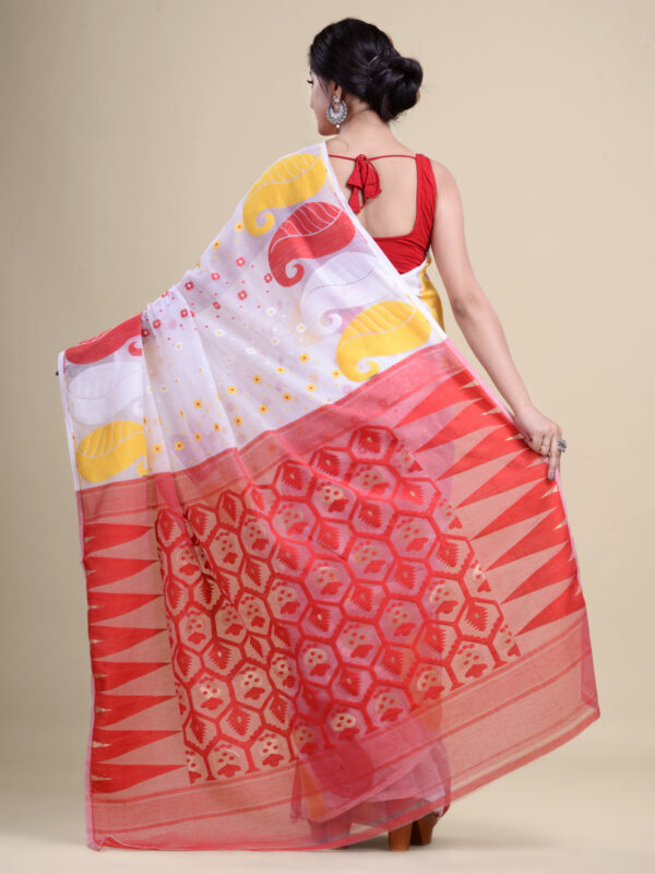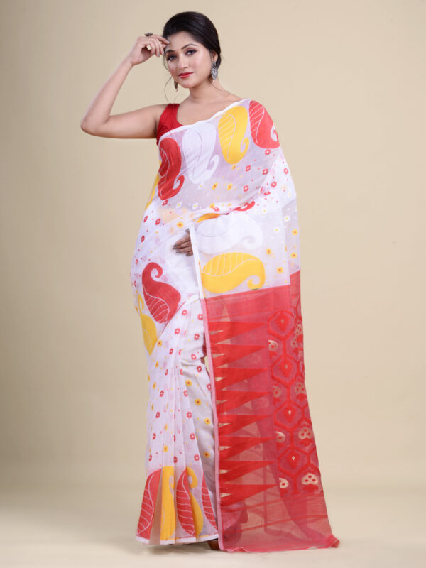 White & Red floral design pure cotton Dhakai Jamdani Saree.