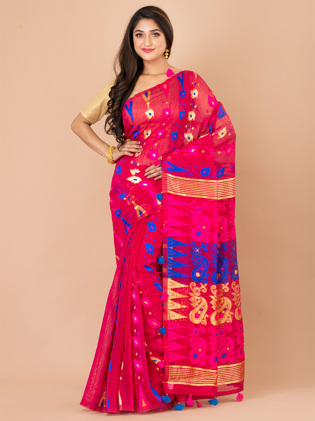 Our Jamdani Sarees is made of soft cotton and feature intricate dhakai