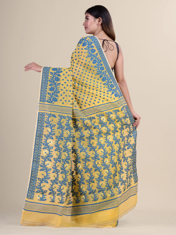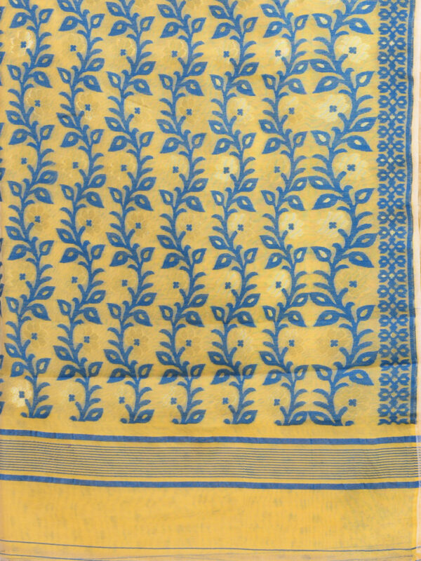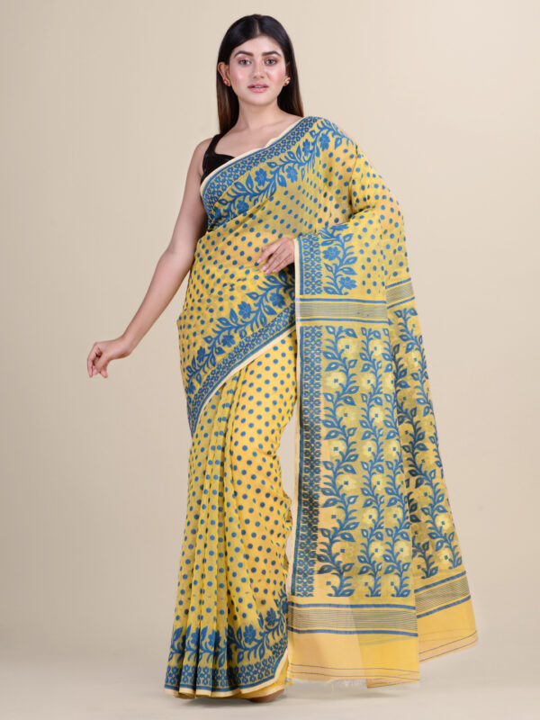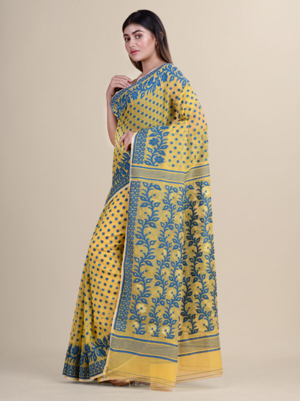 Yellow & Blue floral design cotton silk Dhakai Jamdani Saree.