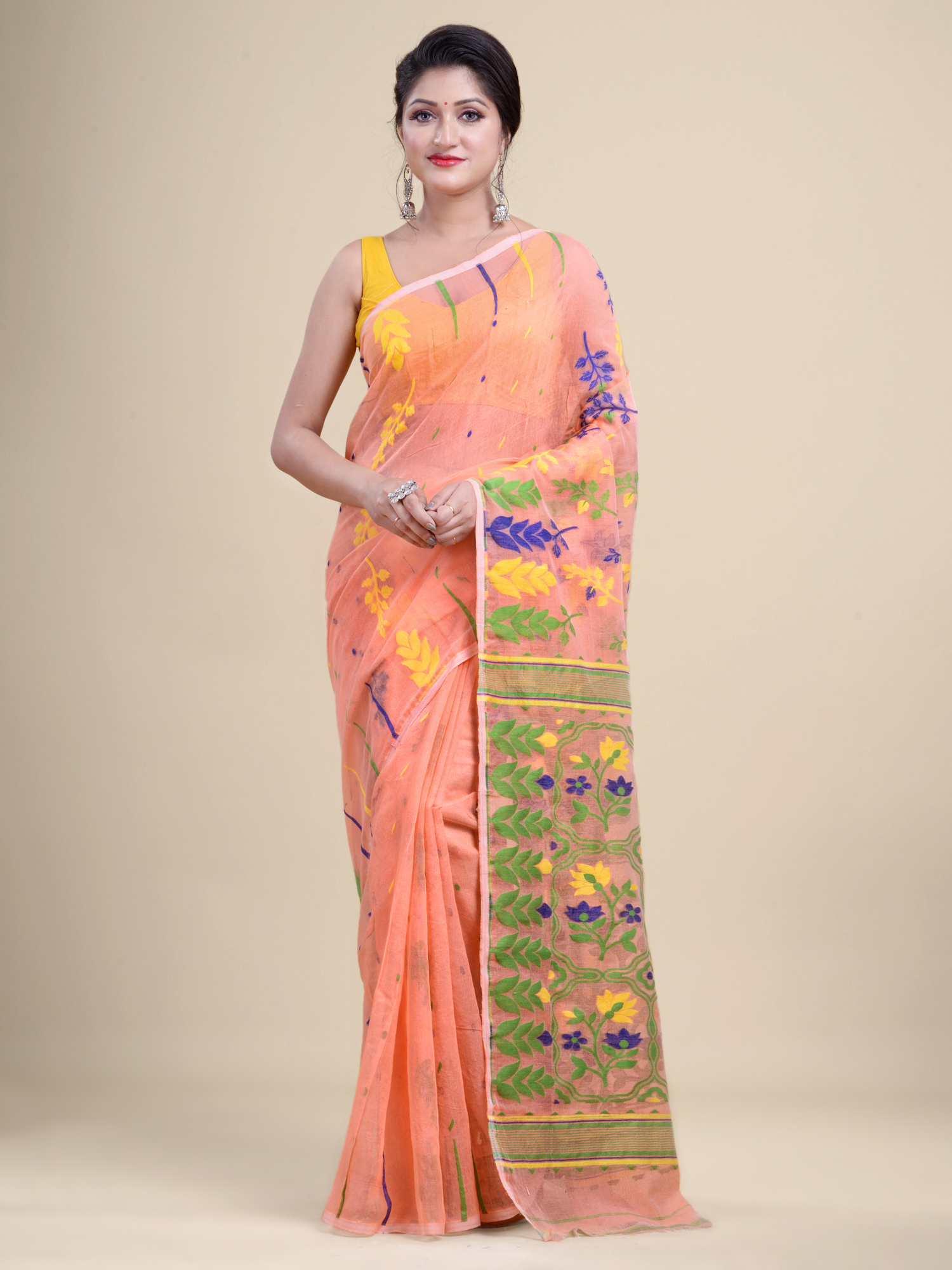 Laa Calcutta’s Jamdani Sarees is made of soft cotton and feature intricate dhakai jamdani designs. Our Jamdani Silk Sarees are also popular for their beautiful designs and quality craftsmanship. Jamdani saree is all about floral, paisley, ethnic motifs design on it. The vivid color and the comfortable fabric makes it more worthy.