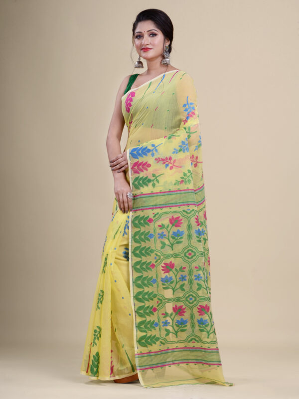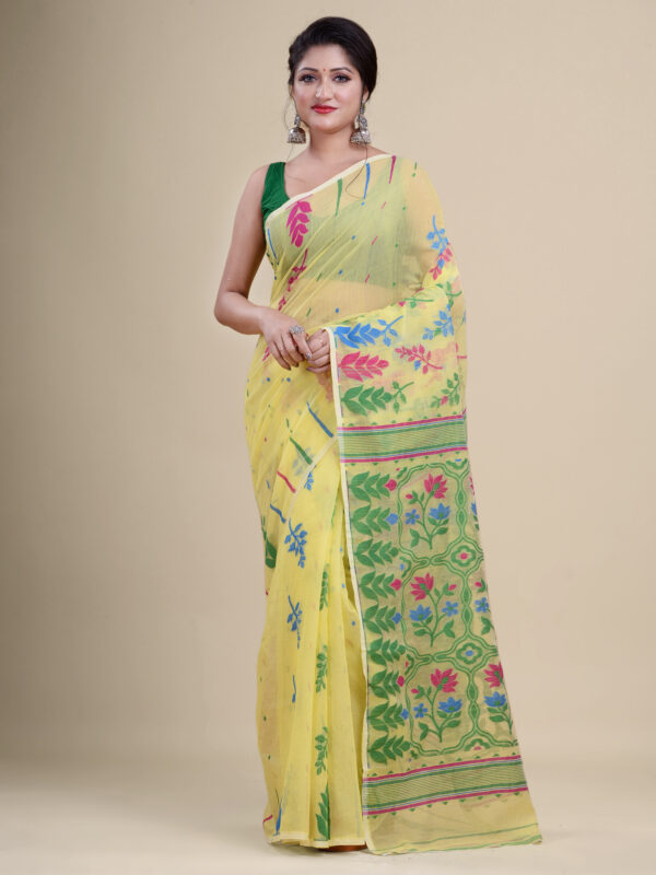 Yellow & Green pure cotton Dhakai Jamdani Saree.