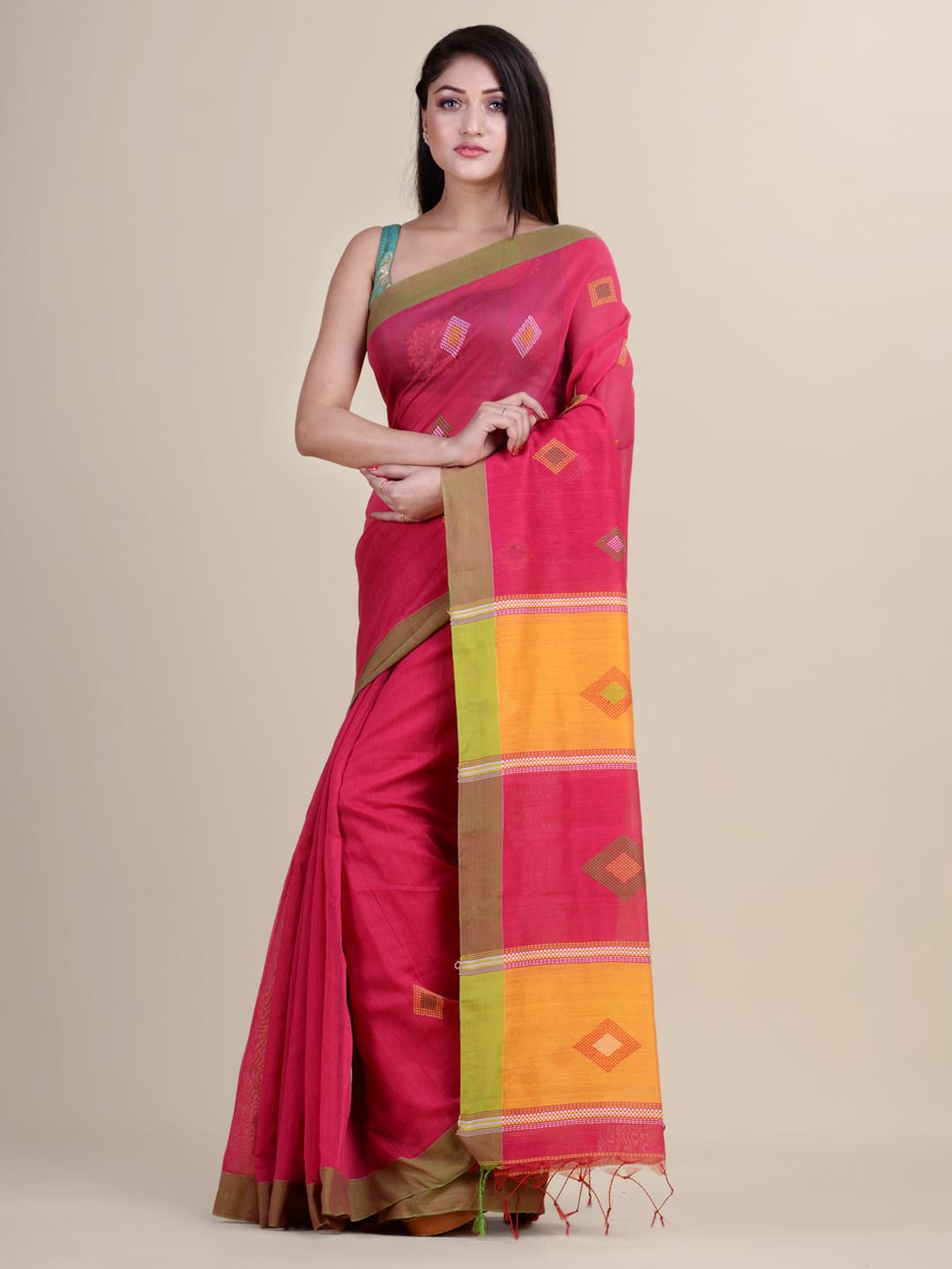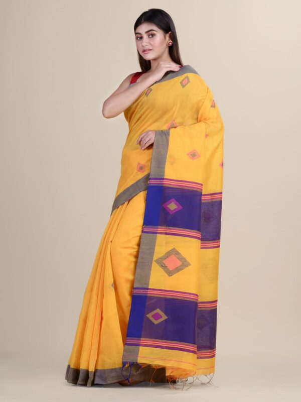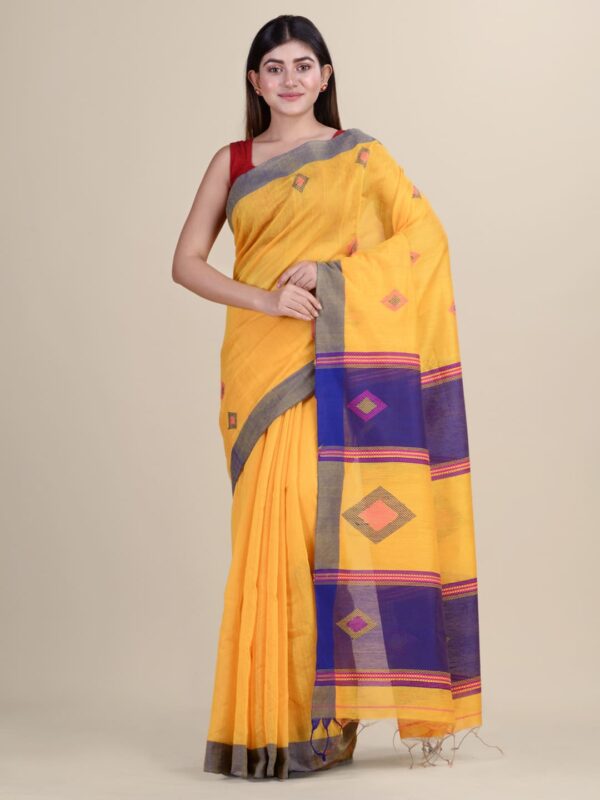 The Handloom sari is a traditional Indian attire that can be worn on all occasions, be it a wedding or a religious event. It has become very popular among women in India. This handloom sari is made from soft cotton fabric and decorated with multi-color thread-weaved designs to give it an elegant look. This beautiful sari is a great investment piece and can be worn on all occasions. It comes with an unstitched blouse piece which will fit perfectly with your body type.