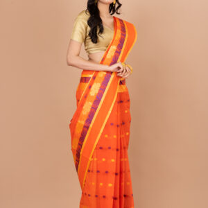 Bengali, Color, Cotton, Culture and Tradition, Diwali, Durga Puja, Fabric, Festival, LAA CALCUTTA GARAGE, Multi, NEW ARRIVALs, Orange, Pujo/Puja, Red, Saree, Tant Sarees