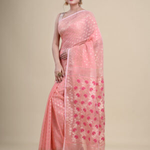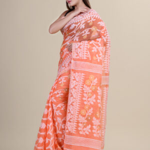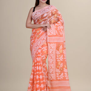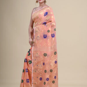 Peach & Multi pure cotton floral design jamdani saree
