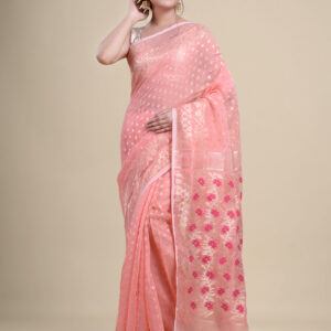 Peach & Green pure cotton Dhakai Jamdani Saree.